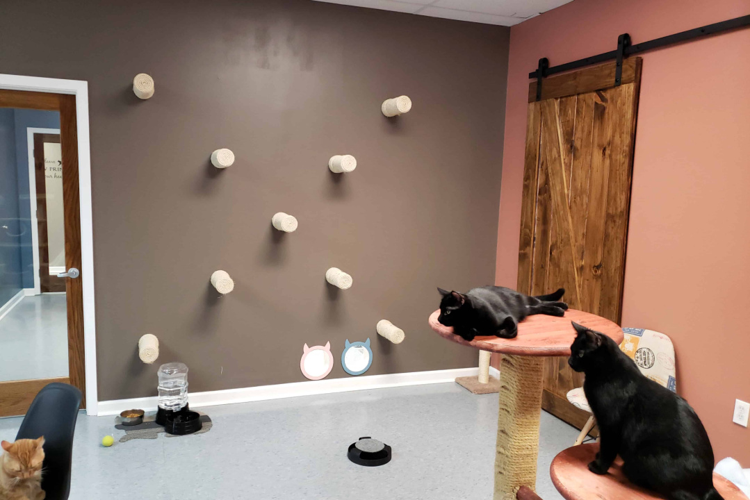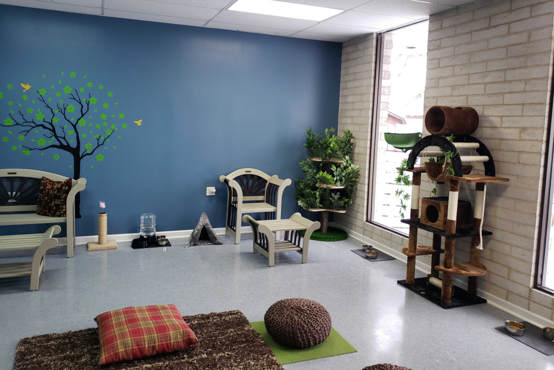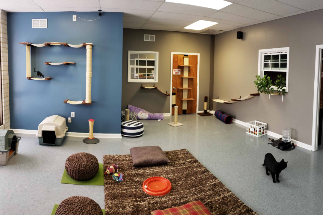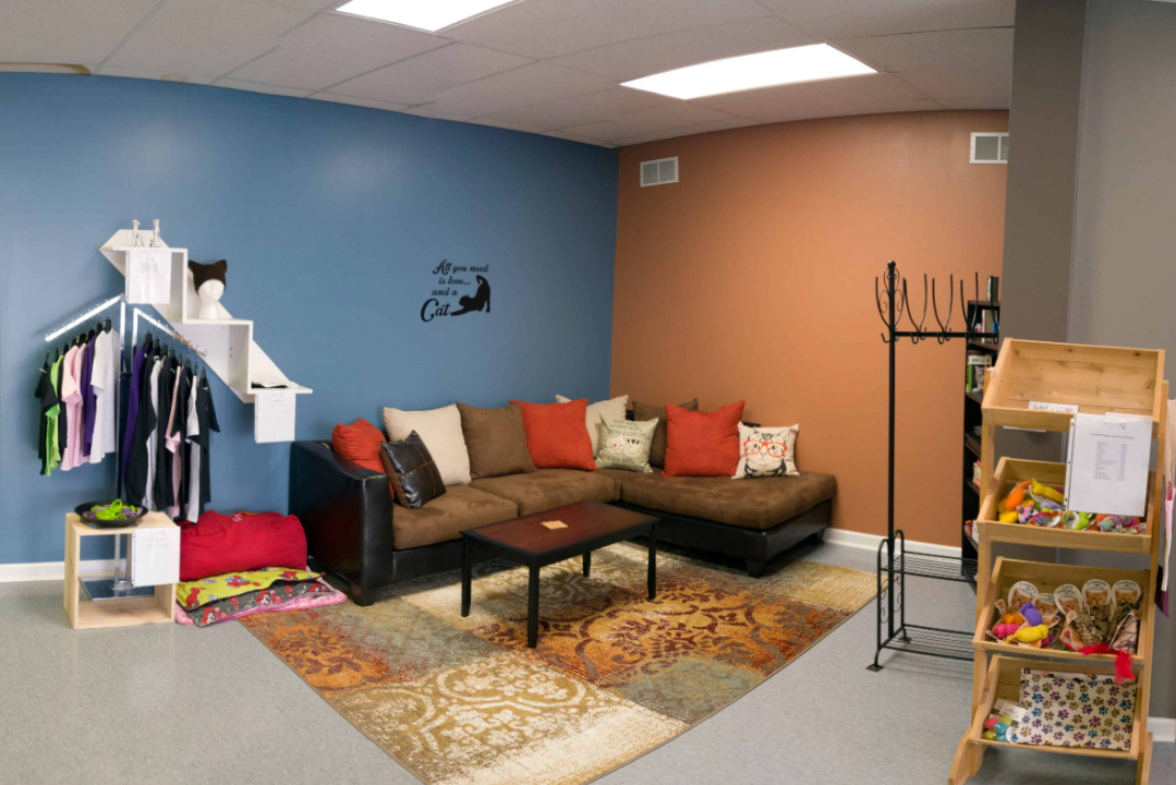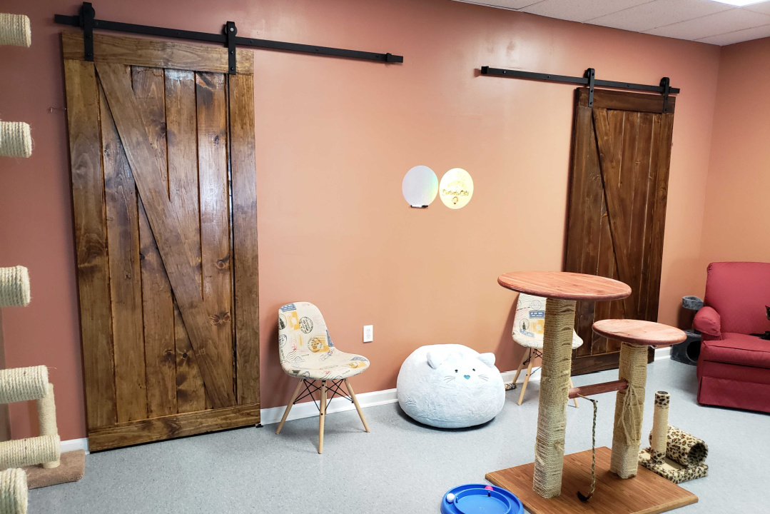 The front room start to resemble a porch area. With large exterior windows the outside is brought into the space. Interior double hung windows are perfect for the cats to hang out. The inner room start to mimic a family room environment. Both spaces will act as flex space in the future. Plans for art and yoga classes will allow even more interaction between people and cats.